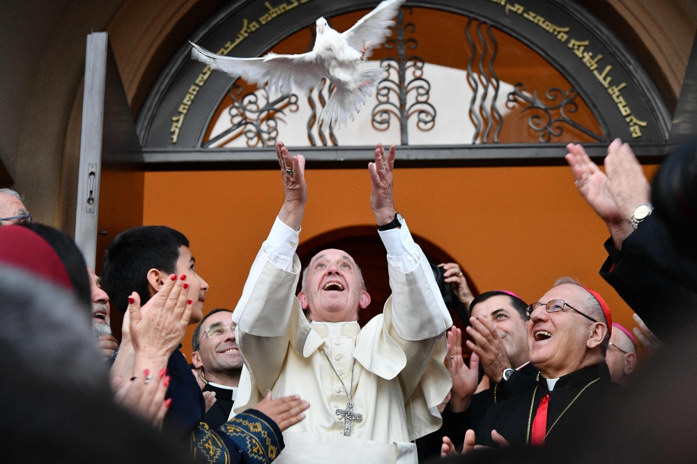 (Files) Pope Francis (C) releases a dove as a symbol of peace during a meeting with Chaldean community at the Catholic Church of St Simon Bar Sabbae in Tbilisi, on September 30, 2016. (Photo by Vincenzo Pinto / AFP)