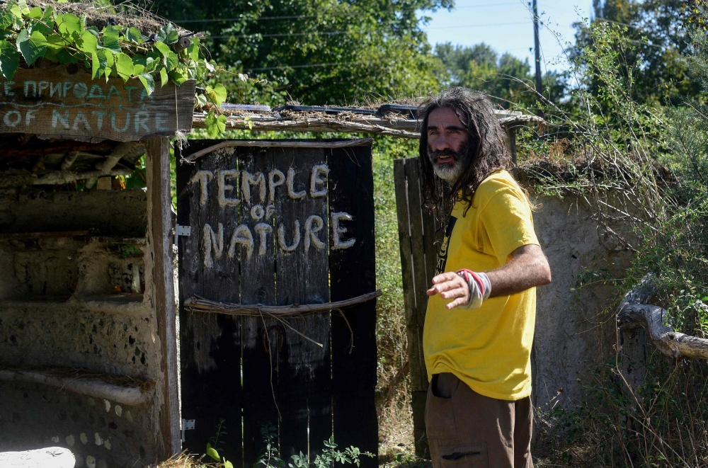 Dimche Ackov shows his makeshift home constructed from entirely locally-sourced supplies, near the town of Veles, in central North Macedonia on October 7, 2023. (Photo by Robert Atanasovski / AFP)