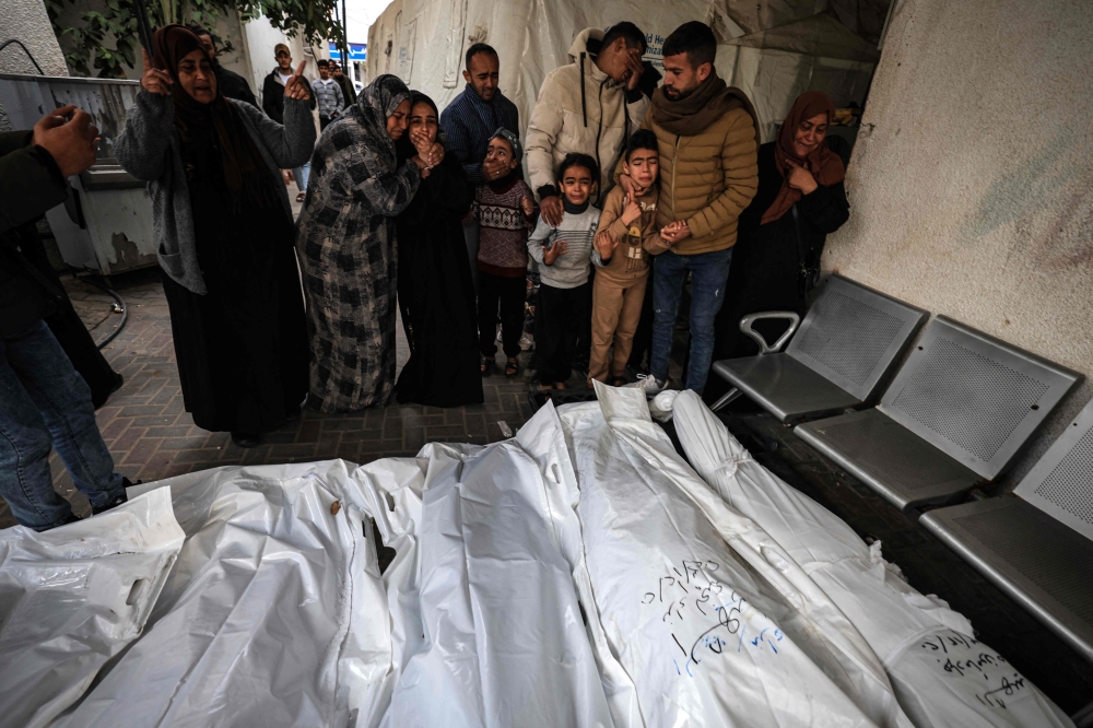 Relatives of Jehad Arafat, killed in Israeli bombardment, mourn over his body at the Najar hospital in Rafah, in the southern Gaza Strip on December 21, 2023. (Photo by Mahmud HAMS / AFP)