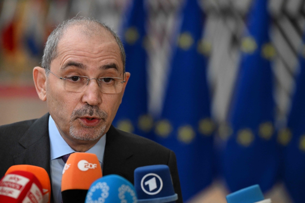 Jordan's Minister of Foreign Affairs Ayman Safadi speaks to the media at the EU headquarters in Brussels on January 22, 2024. (Photo by John Thys / AFP)