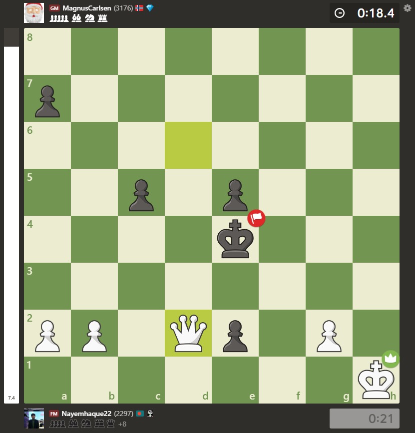 Carlsen, playing as black, resigned after white’s 50th move of the game, with Nayemhaque22 being up a queen and having greater positional advantage.