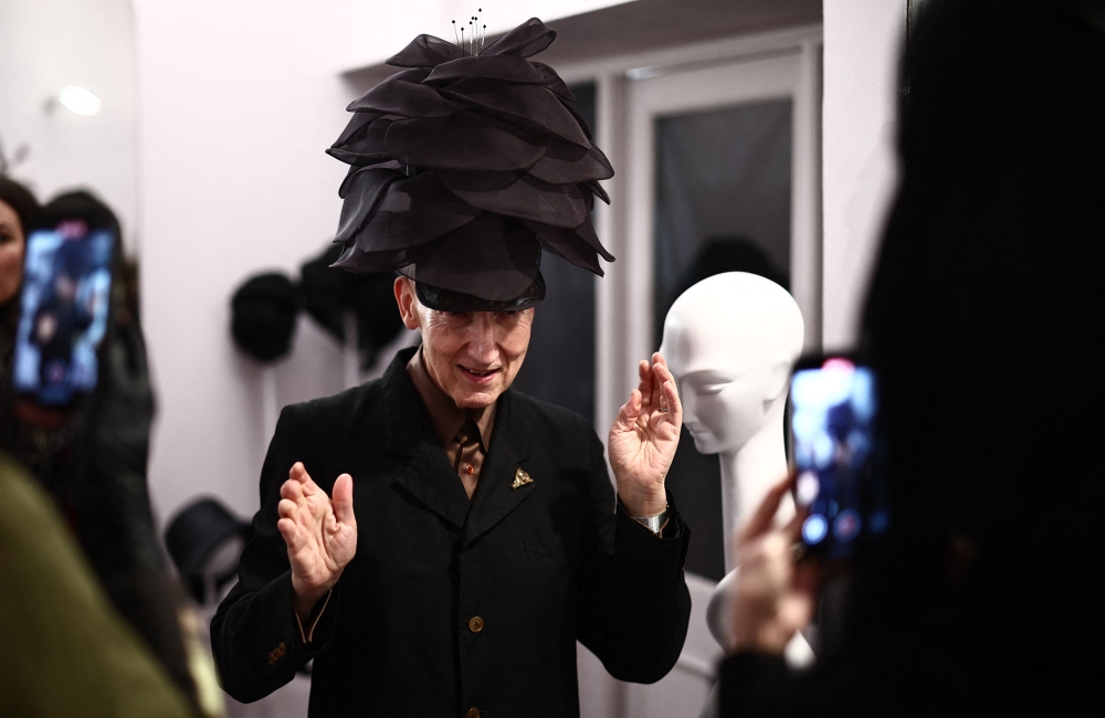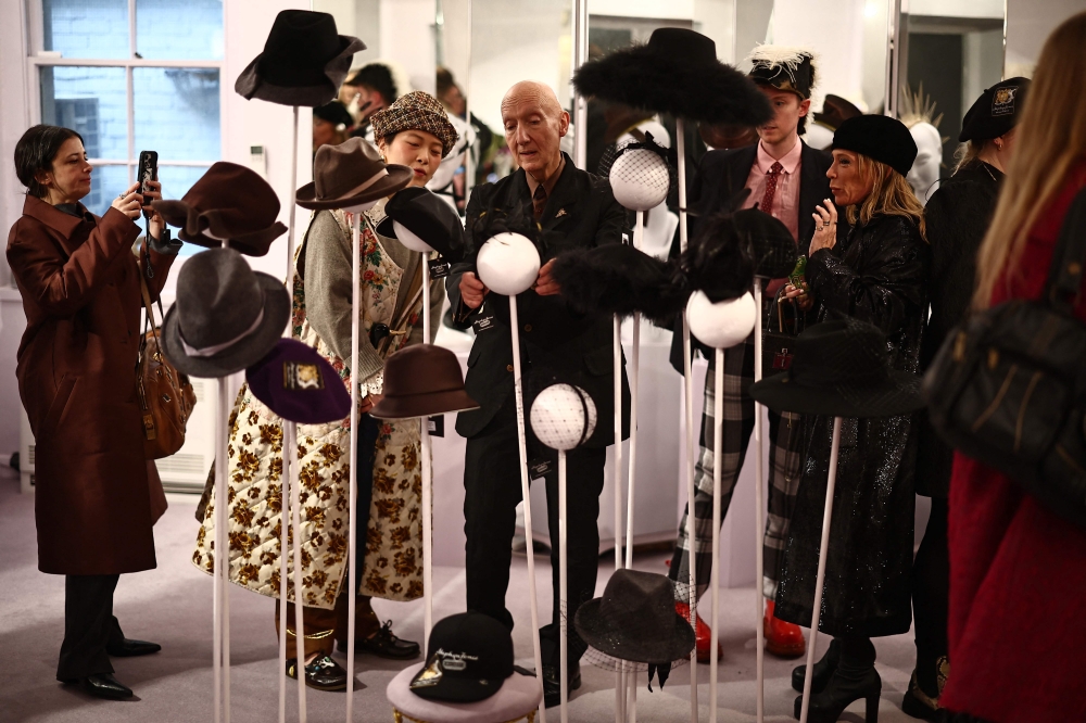 British milliner Stephen Jones (C) speaks with a visitor as he presents his Autumn-Winter 2025-2026 collection in London, on February 21, 2025. (Photo by Henry Nicholls / AFP)