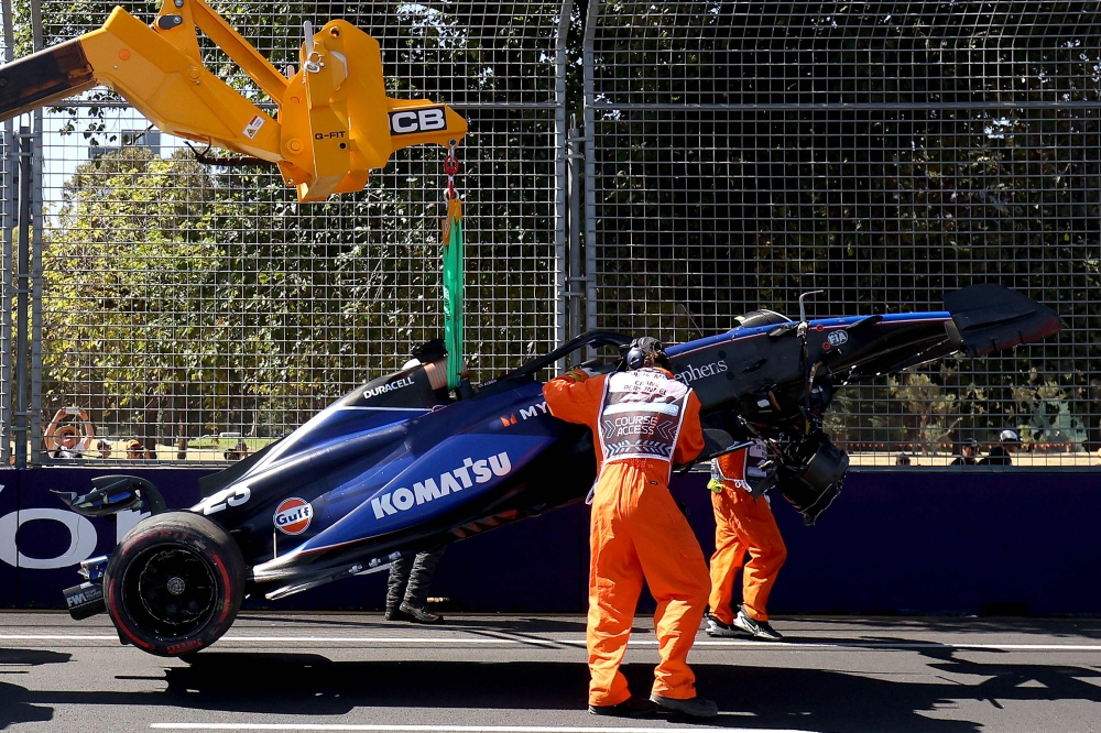 Marshals remove Williams' Thai driver Alexander Albon crashed car from the circuit during the first practice session of the Formula One Australian Grand Prix at the Albert Park Circuit in Melbourne on March 22, 2024. (Photo by Martin KEEP / AFP)