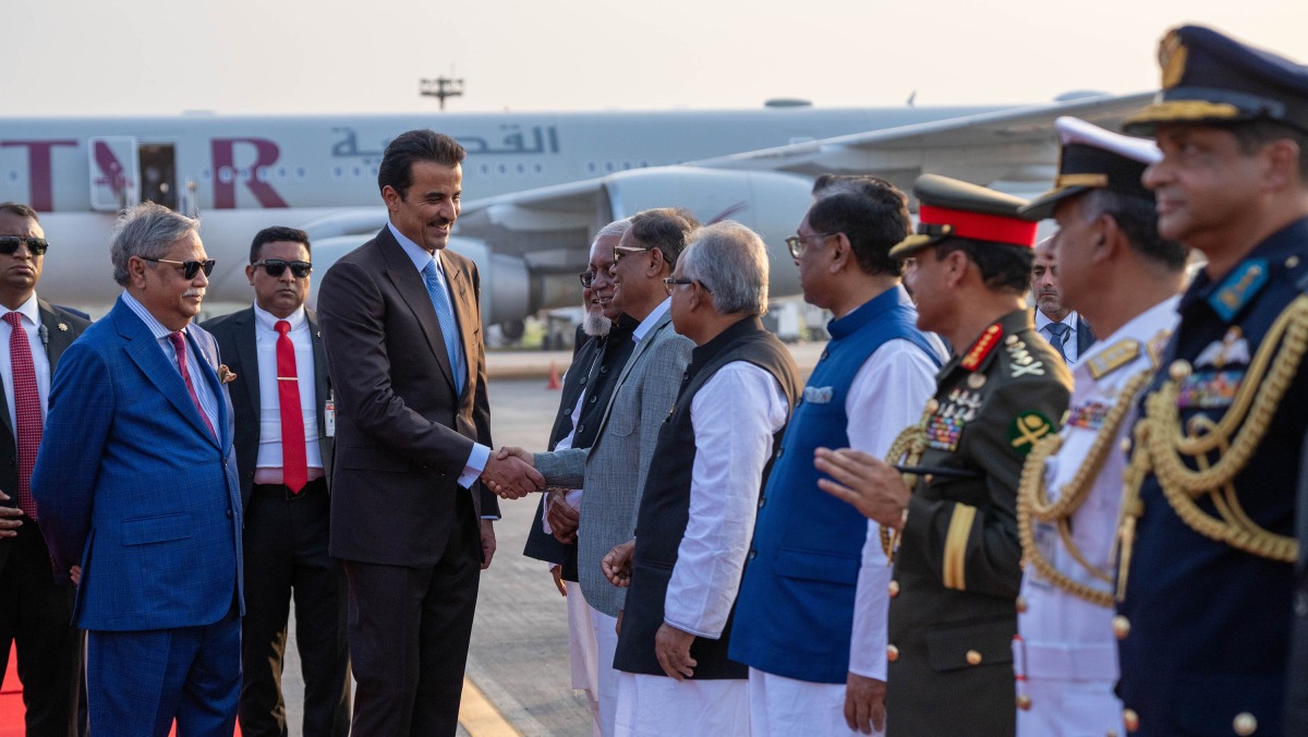 His Highness was also welcomed upon arrival by HE Member of Parliament and Minister for Liberation War Affairs Mozammel Haque, HE Member of Parliament and Minister of Home Affairs Asaduzzaman Khan, HE Member of Parliament and Minister of Foreign Affairs Dr. Hasan Mahmud, HE Member of Parliament and Minister of State for Expatriates' Welfare and Overseas Employment Shofiqur Rahman Choudhury, HE Ambassador of the State of Qatar to Bangladesh Saree Ali Mahdi Saeed Al Qahtani, HE Ambassador of Bangladesh to the State of Qatar Mohammed Nazrul Islam, alongside several high-ranking officials in the Bangladeshi government, a number of Their Excellencies Ambassadors of Organization of Islamic Cooperation (OIC) countries, and members of the Qatari Embassy.