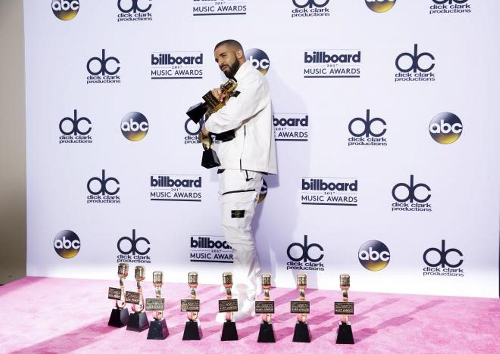 Drake, who also won top artist, top male artist and top rap album for "Views", later posed for photographers surrounded by his microphone-shaped trophies.