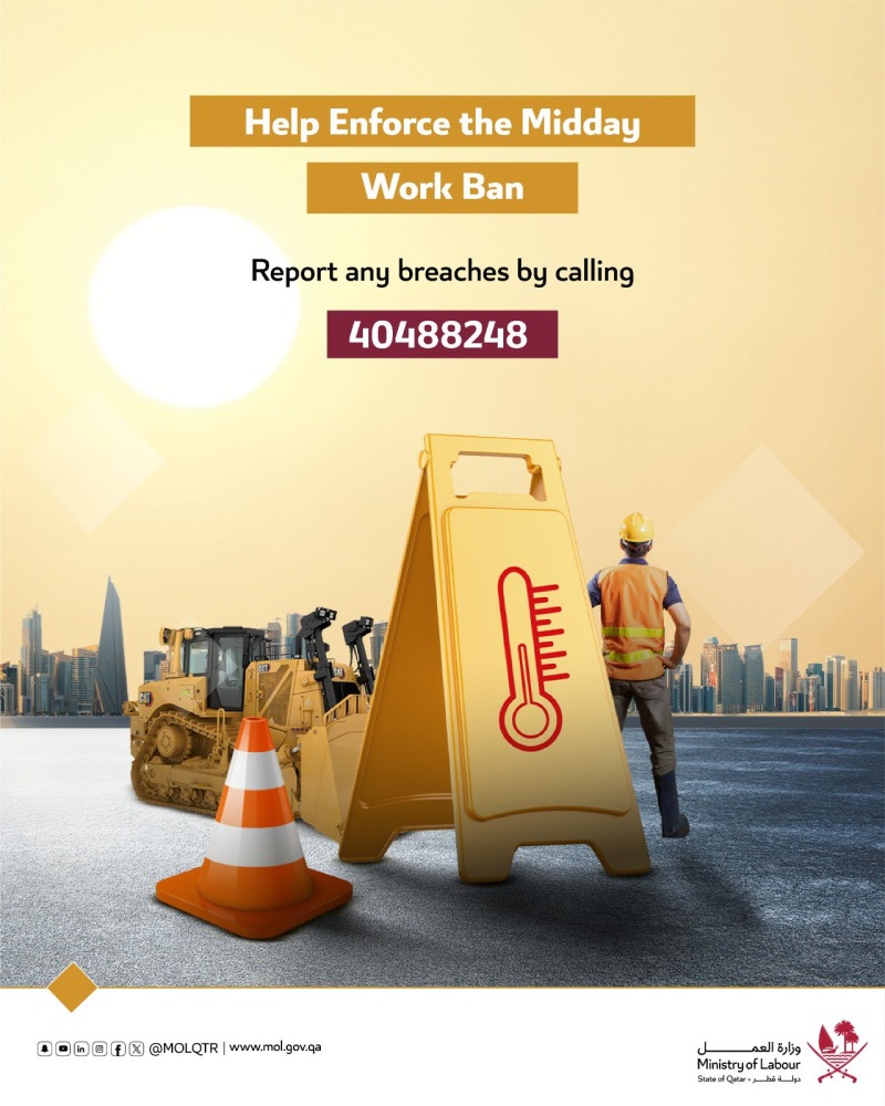 Doha, Qatar: The Ministry of Labour urges the public to report any violations of the outdoor work ban in place from 10 am to 3:30 pm during summer.