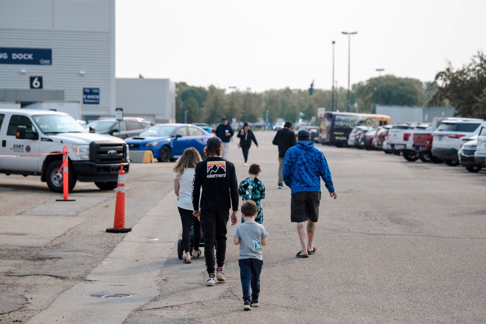 Evacuees from the Northwest Territories leave the evacuation center at the Expo Center in Edmonton, Alberta, Canada, on August 21, 2023. (Photo by Andrej Ivanov / AFP)