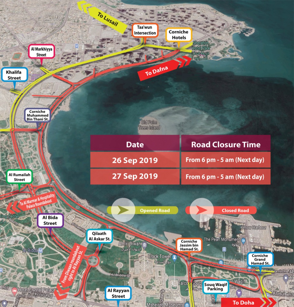 Ministry of Interior has announced that Corniche will be closed for traffic on September 26 and 27 for the marathon as part of the 17th IAAF World Athletics Championships, Doha 2019.