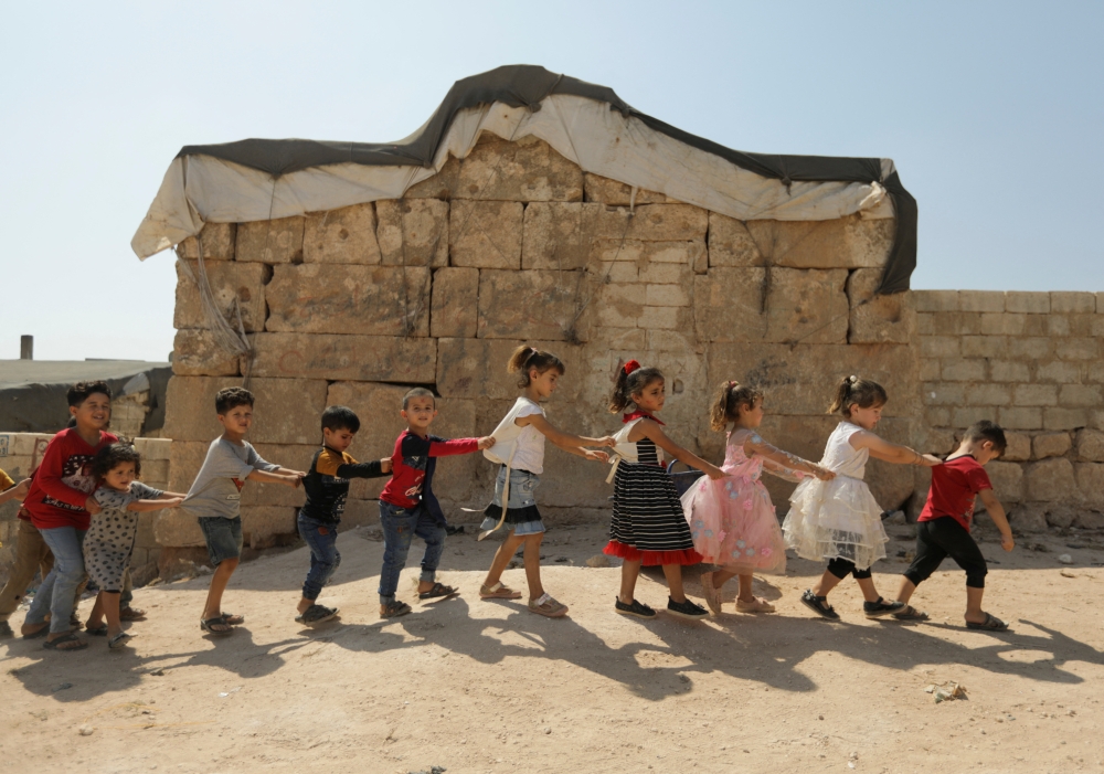 Internally displaced children walk together in the opposition-held Idlib, Syria, on September 20, 2022. (REUTERS/Khalil Ashawi)