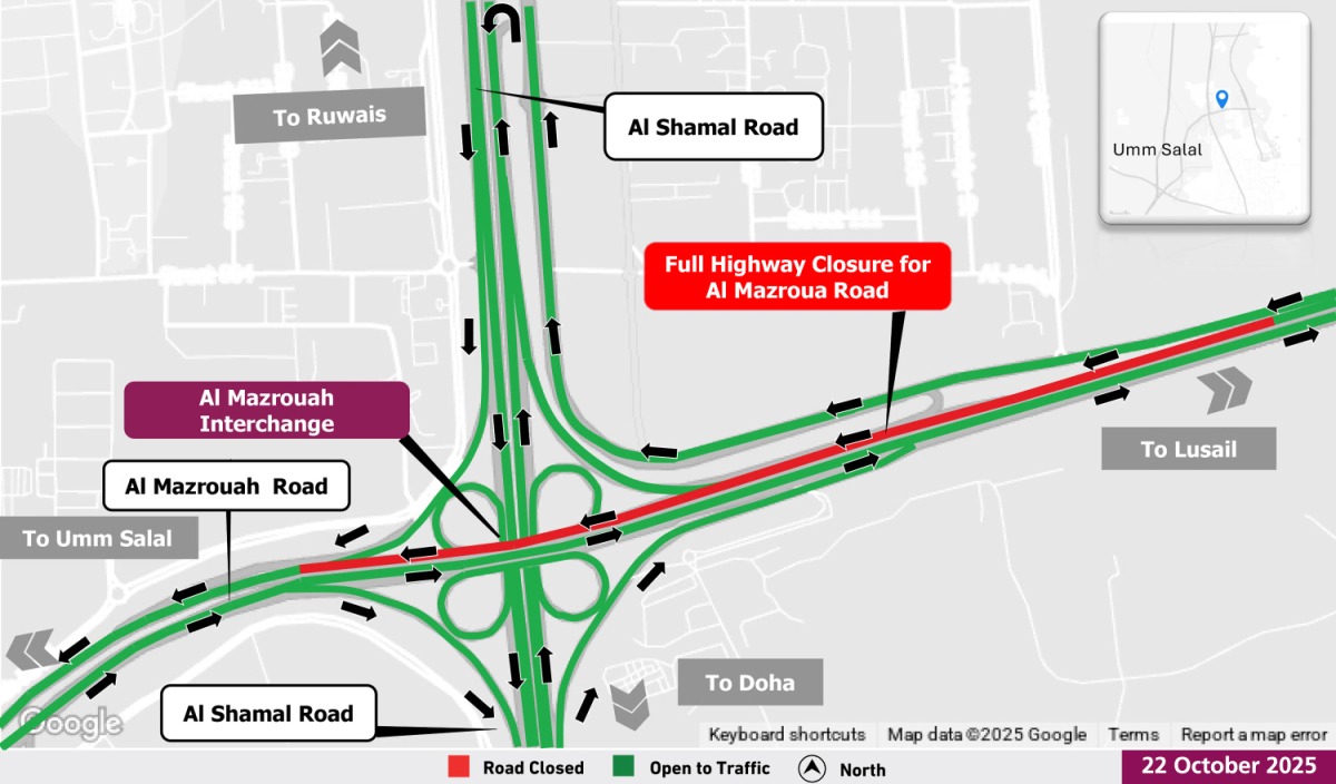 A temporary full road closure on Al Mazrouah Road for traffic coming from Lusail via Al Mazrouah Interchange and heading toward Um Slal Ali will be in place.