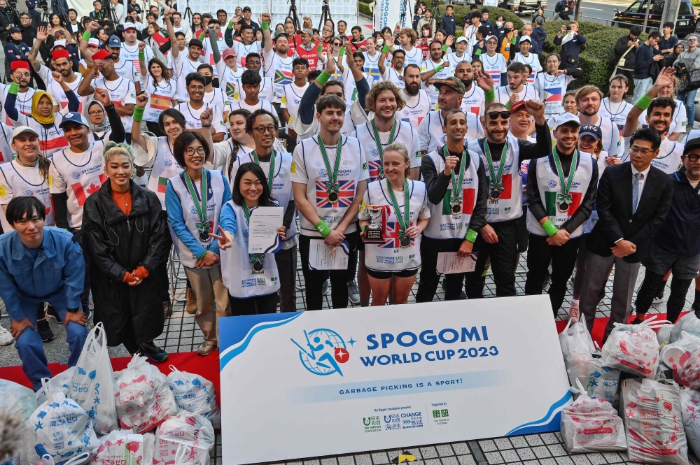 Members of the first-placed British team (C front), second-placed Japan (front L) and third-placed Italy (front R) pose with the other participants for a group photo after the "SpoGOMI World Cup 2023" final. (Photo by Richard A. Brooks / AFP)