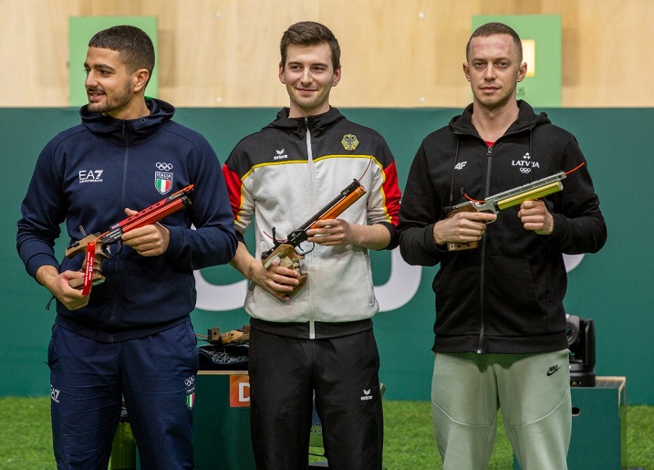 The podium winners in the men's 10m Air Pistol, champion Robin Walter, second place winner Paolo Monna and bronze winner Emil Vasermanis.