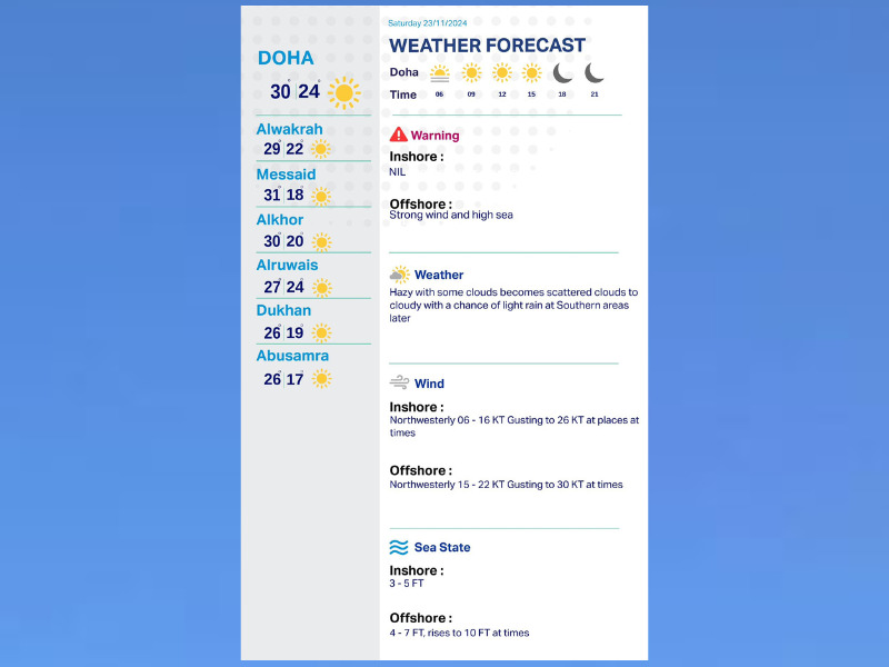 Doha, Qatar: There is a chance of light rain in southern Qatar tomorrow, November 23, according to the Qatar Meteorology Department (QMD).