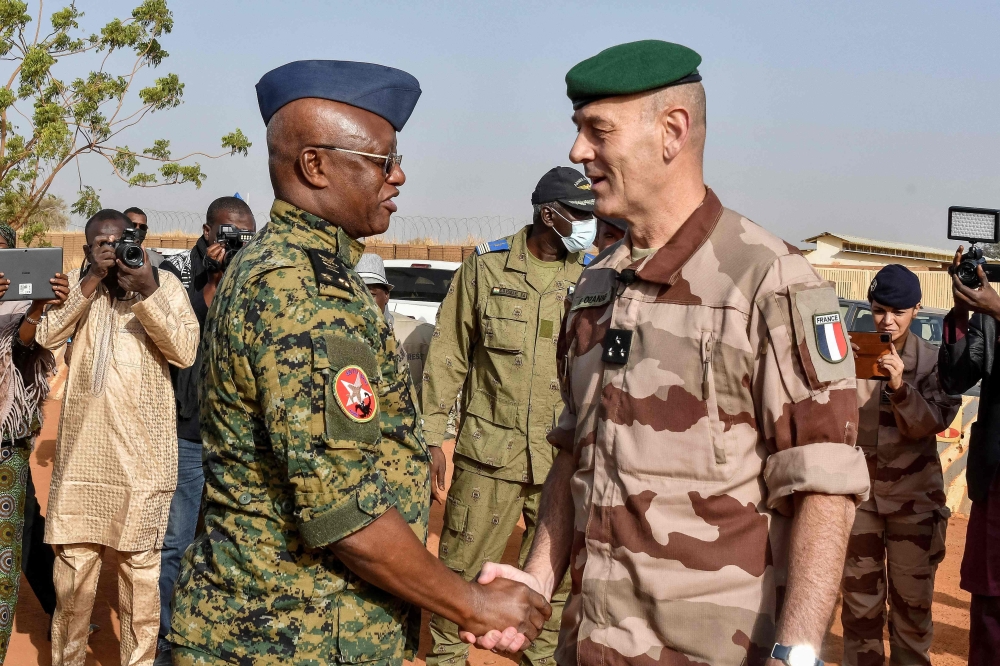 General Eric Ozanne (right), commander of French forces in the Sahel chakes hands with the Chief of staff of the Armies of Togo, mediating in the process of withdrawal of French soldiers in Niger, at the French base which was handed over to the Nigerien army, in Niamey on December 22, 2023. (Photo by Boureima Hama / AFP)