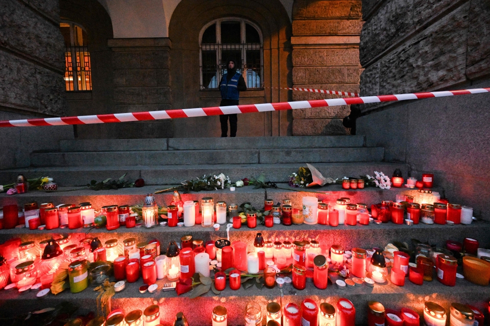 Well wishers light candles as people mourn at a makeshift memorial for the victims outside the Charles University in central Prague, on December 22, 2023, as police investigators kept working on the campus the day after a deadly mass shooting. (Photo by Michal Cizek / AFP)