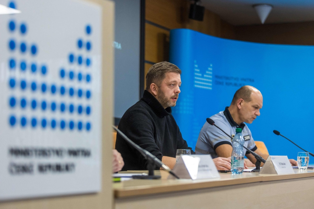 Czech Interior Minister Vit Rakusan (L) and Police Chief Martin Vondrasek give a press conference in the Ministry of the Interior in Prague, Czech Republic, on December 22, 2023, to inform about a deadly mass shooting at a university the day before. (Photo by Radek Mica / AFP)