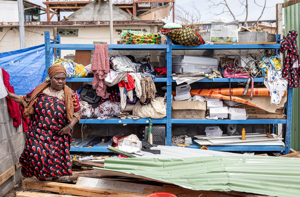 A woman walks inside her damaged shop in the city of Mamoudzou on the French Indian Ocean territory of Mayotte, after the cyclone Chido hit the archipelago on December 22, 2024. Photo by PATRICK MEINHARDT / AFP.