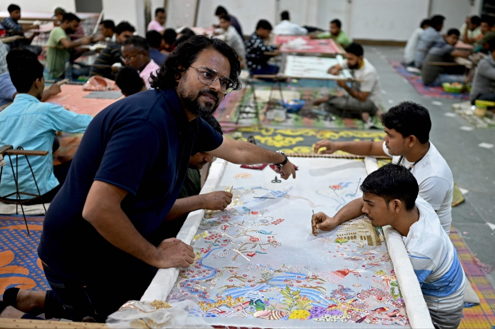 In this photograph taken on October 19, 2022, Indian fashion designer Rahul Mishra (L) sits with the men working on his designs at a workshop in Noida. (Photo by Money Sharma / AFP)