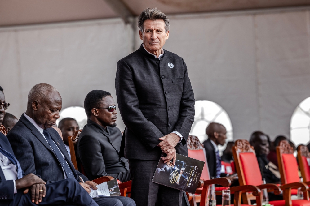 President of the International Athletics Federation Sebastian Coe (2nd R) looks on while attending the funeral proceedings of the late marathon runner Kelvin Kiptum in Chepkorio on February 23, 2024. (Photo by LUIS TATO / AFP)