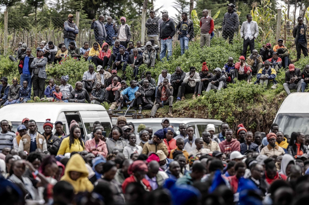 People gather on a hill while attending the funeral proceedings of the late marathon runner Kelvin Kiptum in Chepkorio on February 23, 2024. (Photo by LUIS TATO / AFP)