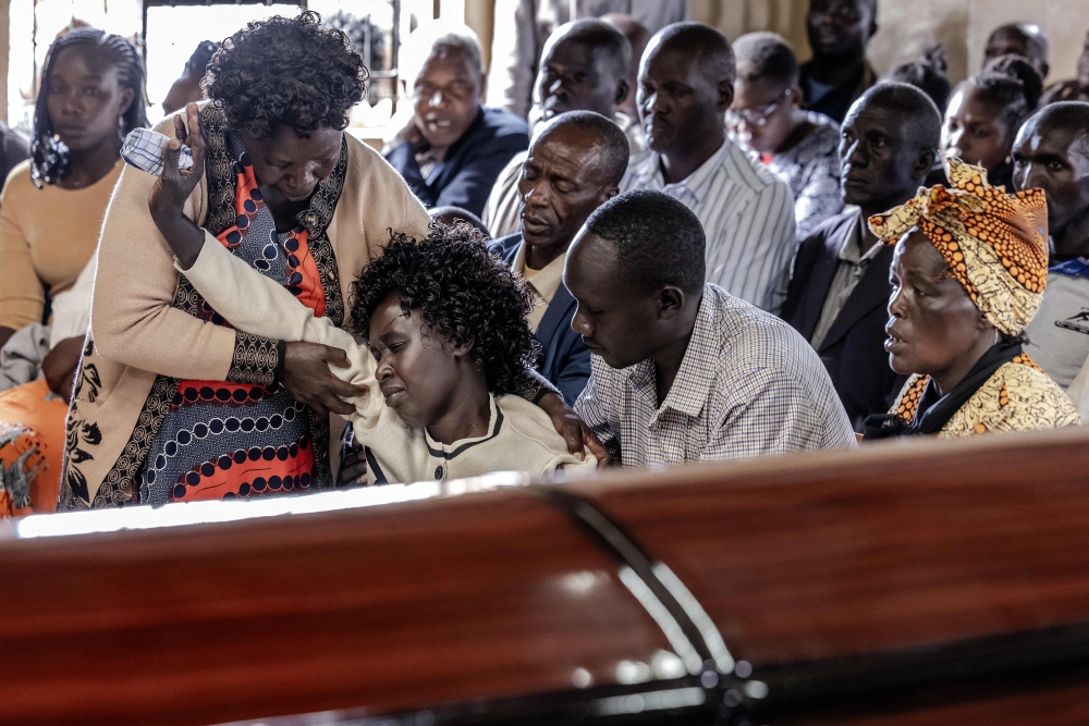 Kelvin Kiptum's mother Mary Kangongo (2nd L) is comforted by other members of the family during a memorial mass for the late marathon runner at a church in the village of Chepkorio, on February 22, 2024. (Photo by LUIS TATO / AFP)