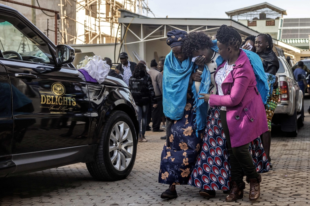 Kelvin Kiptum's mother Mary Kangongo (C) followed by Kelvin Kiptum's wife Asenath Rotich (2nd L) are comforted by other family members while arriving at the mortuary ahead of the beginning of his funeral proceedings in Eldoret, on February 22, 2024. (Photo by LUIS TATO / AFP)