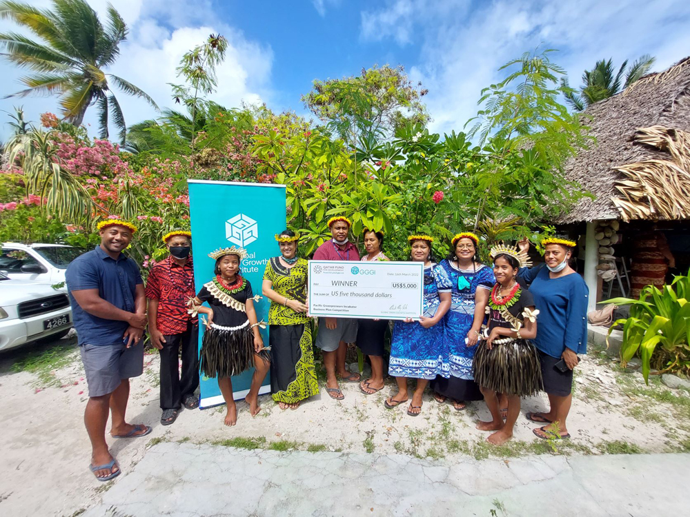 Graduating ‘Greenpreneurs’ from the remote Pacific nation of Kiribati and their coaches and Guests of Honour, the Honourable Mayors Baraniko Baaro and Botika Matinnara. The event was covered extensively by local Kiribati television. Local dancers entertained and garlanded guests to recognize Kiribati participants successful completion of the Pacific Greenpreneurs Incubator program implemented by the Global Green Growth Institute and funded by the Qatar Fund for Development.
