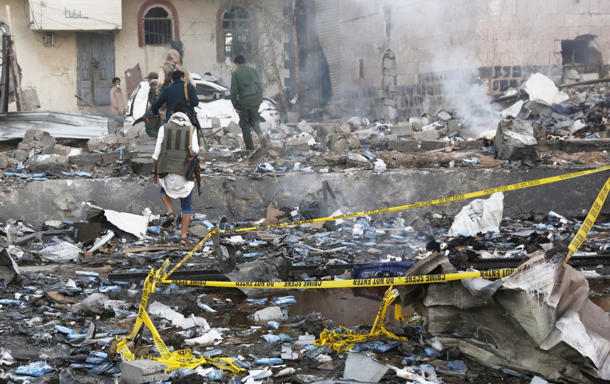 People inspect the site after U.S. airstrikes in Sanaa, Yemen, on March 20, 2025. (Photo by Mohammed Mohammed/Xinhua)