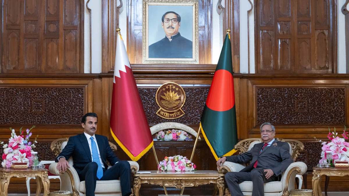Doha, Qatar: The Amir His Highness Sheikh Tamim bin Hamad Al Thani held a meeting with His Excellency Mohammed Shahabuddin, President of the friendly People's Republic of Bangladesh, at the Bangabhabhan Presidential Palace in the capital, Dhaka, today.