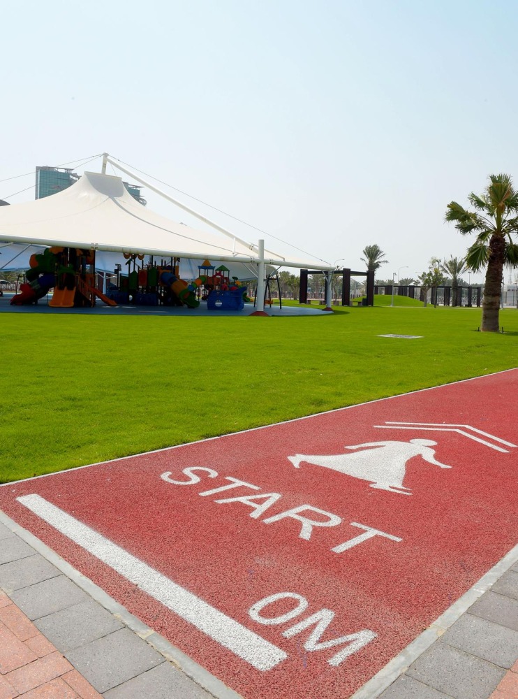 The park includes a sports walkway with a rubber floor stretching 676 meters and covers an area of about 38,029 square meters, with green spaces constituting about 11,316 square meters of natural grass, trees, and palms, which are watered by the latest modern automatic irrigation methods.