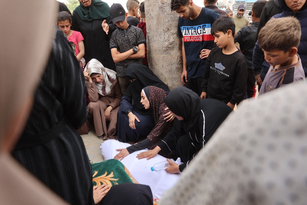 Palestinians mourn during a funeral of relatives, killed in an Israeli strike on a school-turned-shelter, at the Al-Shifa hospital in Gaza City on April 23, 2025. Photo by Omar AL-QATTAA / AFP