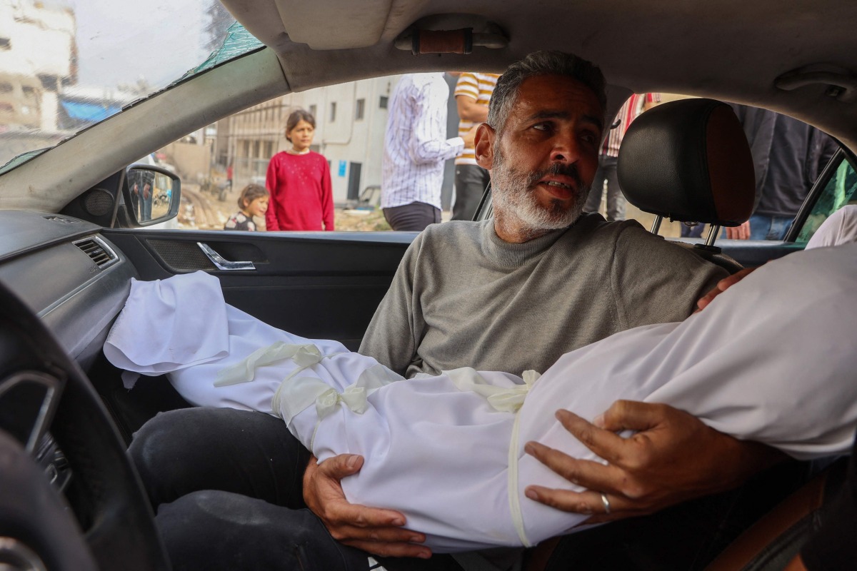 A Palestinian man transports the body of a child, killed in an Israeli strike on a school-turned-shelter, outside the Al-Shifa hospital in Gaza City on April 23, 2025. Photo by Omar AL-QATTAA / AFP