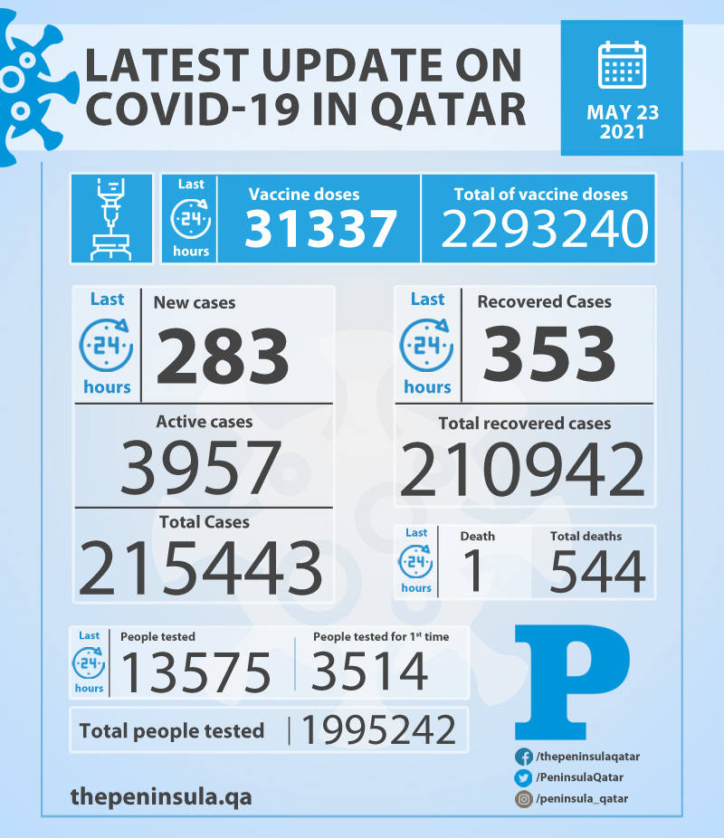 Doha: Ministry of Public Health (MoPH) today reported 283 new cases of coronavirus (Covid-19) and 353 people recovered from the virus in the last 24 hours, bringing the total number of people recovered in Qatar to 210,942.