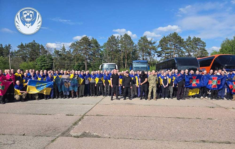 This handout photograph taken and released by Coordinating Headquarters for the Treatment of Prisoners of War on May 23, 2025 shows Ukrainian POWs posing after their exchange. (Photo by Coordinating Headquarters for the Treatment of Prisoners of War / AFP)