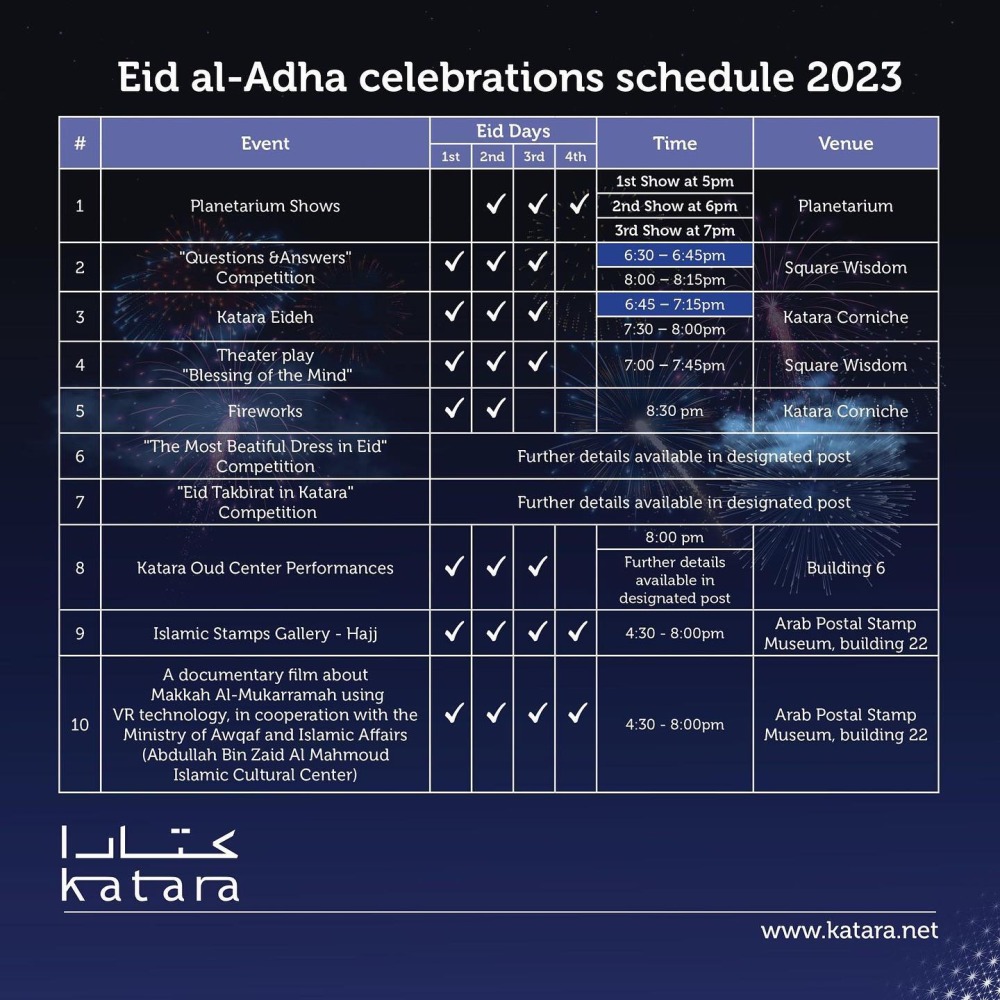 Eid Al Adha celebrations at Katara will take place over four days starting from June 28. Don't miss the fireworks show at Katara Corniche on the first and second days of Eid, at 8:30 pm. Check out the schedule of activities above, which includes Eidiyah (money-giving) on the first three days of celebrations beginning at 6:45 pm.