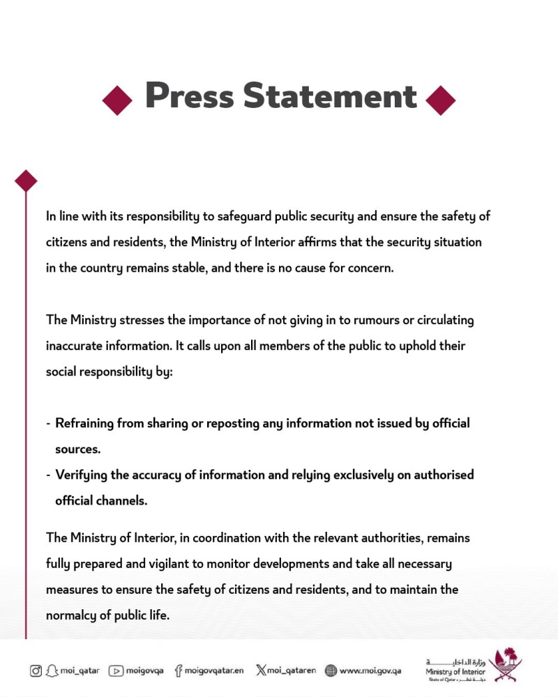 Doha, Qatar: In line with its responsibility to safeguard public security and ensure the safety of citizens and residents, the Ministry of Interior affirms that the security situation in the country remains stable, and there is no cause for concern.