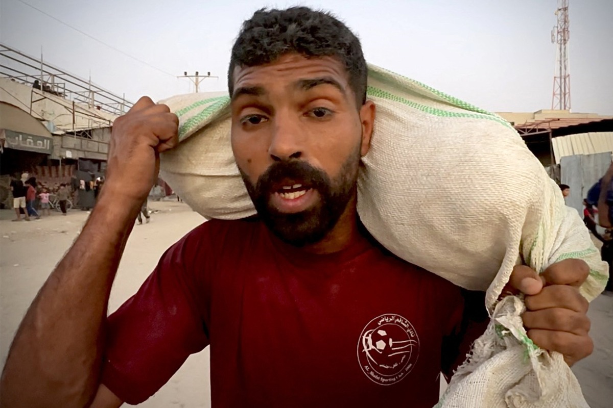 A man walks carrying one of sacks of flour that were taken from a raided truck carry sacks of flour after raiding a truck that was carrying foodstuffs, in Khan Yunis in the southern Gaza Strip on July 22, 2025. (Photo by AFP)