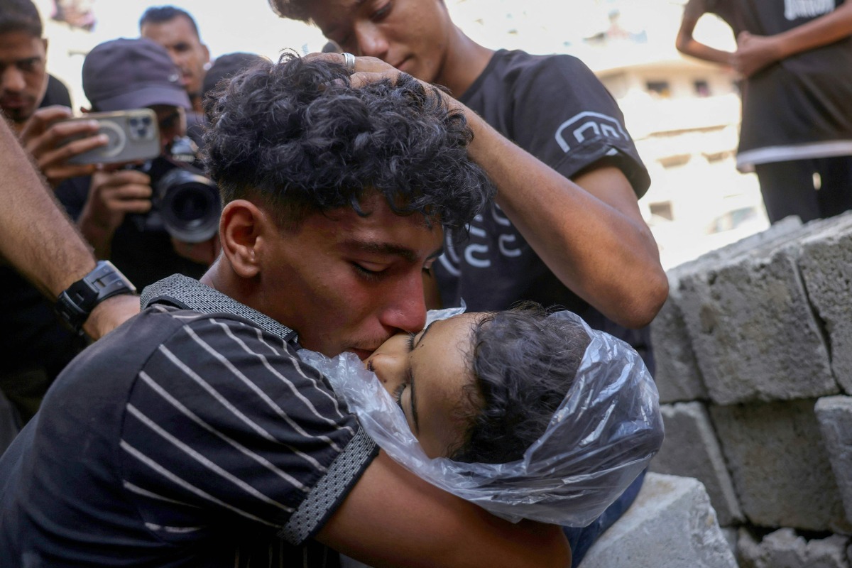 Palestinian boys mourn as they hold the body of a girl who was killed in Israeli strikes, during her funeral at Al-Shifa hospital in Gaza City on July 23, 2025. Photo by BASHAR TALEB / AFP
