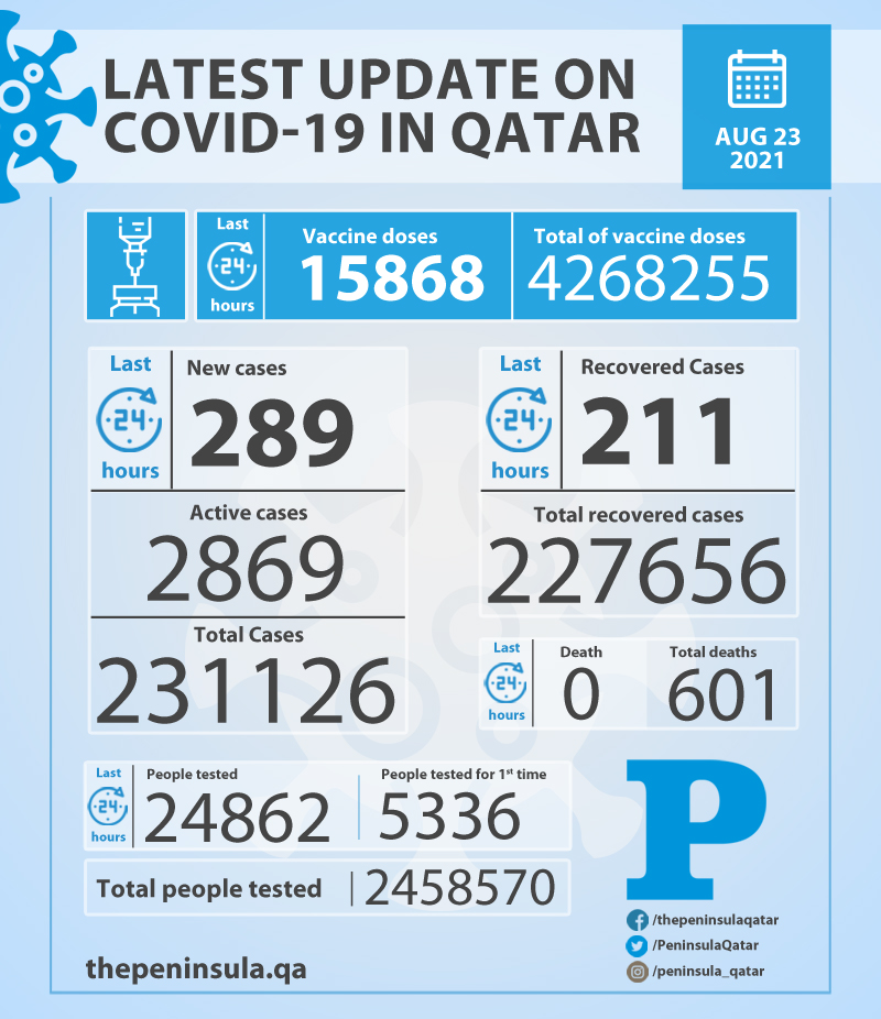 Ministry of Public Health (MoPH) today reported 289 new cases of coronavirus (Covid-19) and 211 people recovered from the virus in the last 24 hours, bringing the total number of people recovered in Qatar to 227,656.