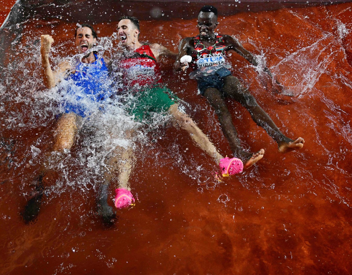 (From left) Men’s high jump gold medallist Gianmarco Tamberi of Italy, winner of the men’s 3000m steeplechase Morocco’s Soufiane El Bakkali and bronze medallist in the men’s 1500m Kenya’s Abraham Kibiwot celebrate in the steeplechase water jump during the World Athletics Championships at the National Athletics Centre in Budapest, yesterday. AFP