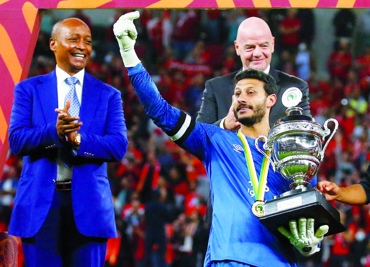 Al Ahly’s Mohamed El Shenawy celebrates after receiving the trophy from FIFA President Gianni Infantino.