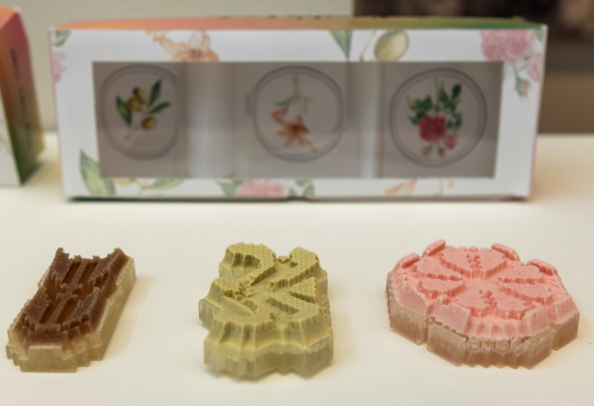 Another of Al Majdobah’s art pieces is called Earth’s Lady. The idea came about when she wanted to create a special Palestinian souvenir to spread its culture around the world. Combining two pivotal cultural facets of Palestine, scents, and embroidery, she created soap bars made up of genuine Palestinian aromas, which when used fully leaves a plastic coaster that is carved with the same patterns of Palestinian embroidery.