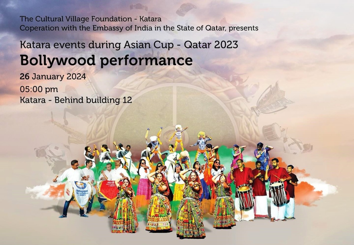 Experience the vibrant colours and rhythms of Bollywood at Katara in celebration of the AFC Asian Cup Qatar 2023. Join the festivities for a dazzling showcase featuring dances like Marathi Dol Tasha, Kerala's lively folk dance (kaikottikali), the energetic beats of chenda melam, the graceful moves of Rajasthani folk dance, the captivating Tiger dance (Puli vesha), Telugu folk dance, and the joyful Marathi folk dance (Mangalgaur).