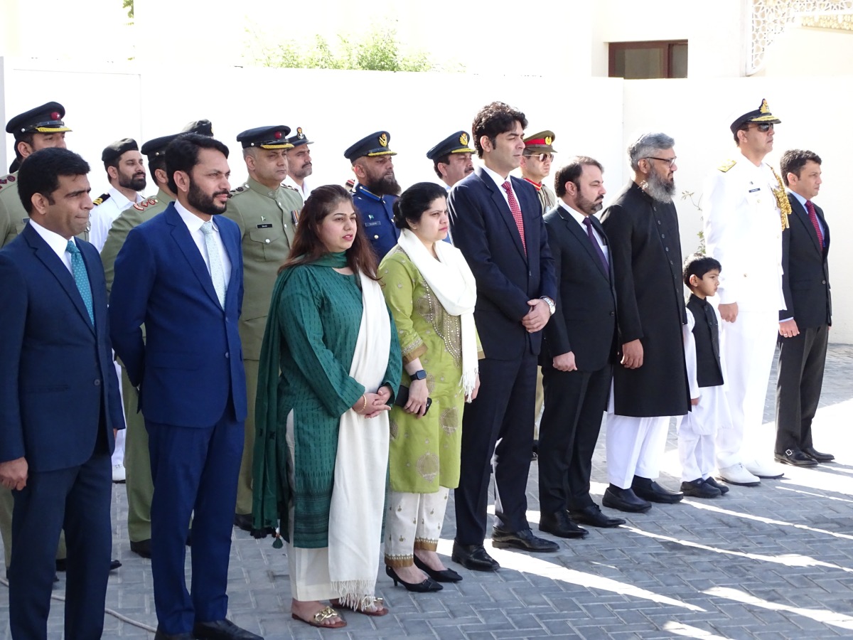 Pakistan Ambassador to Qatar H E Muhemmed Aejaz hoisted the national flag. A smartly turned out military contingent from Pakistan gave salute to the national flag during the National Anthem.