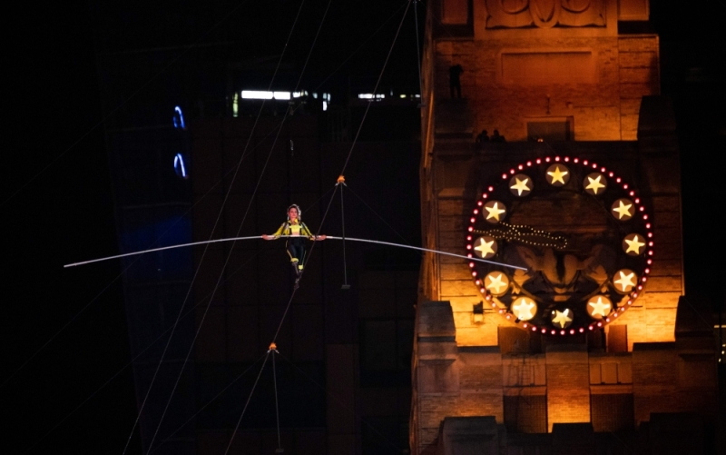 Aerialist Nik Wallenda walks the highwire with his sister Lijana (unseen) over Times Square in New York, U.S., June 23, 2019. REUTERS/Eduardo Munoz