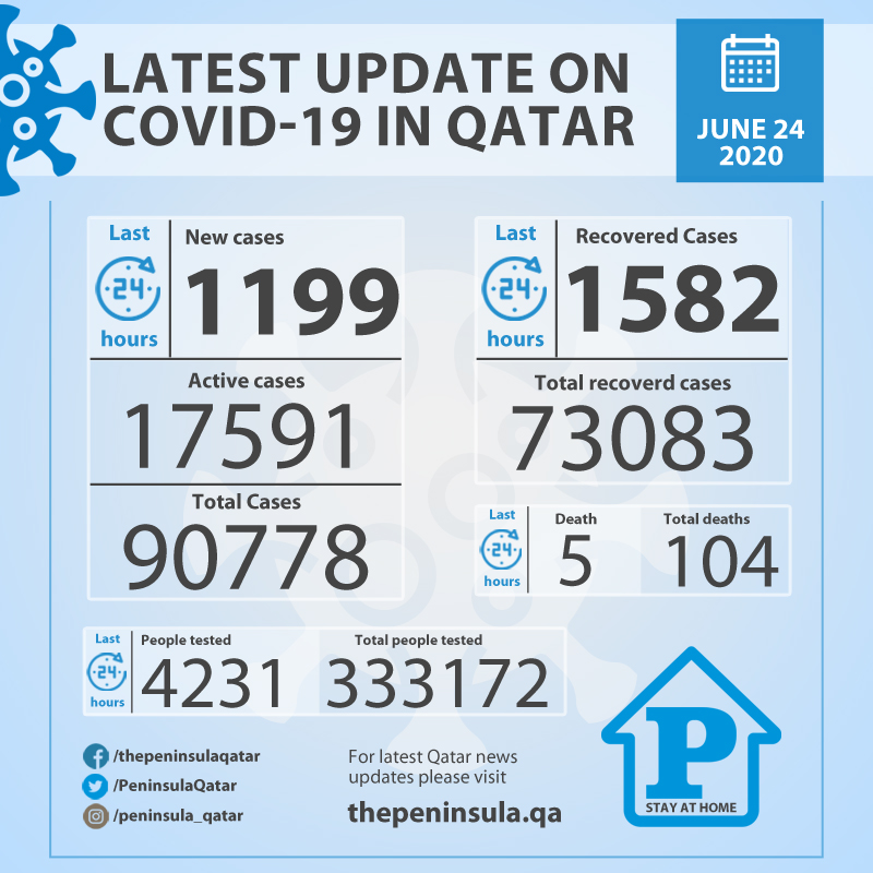 Ministry of Public Health today announced 1,199 new confirmed cases of coronavirus (COVID-19), 1,582 recoveries and 5 deaths from the virus in the last 24 hours. This brings the total number of recovered people in Qatar to 73,083.