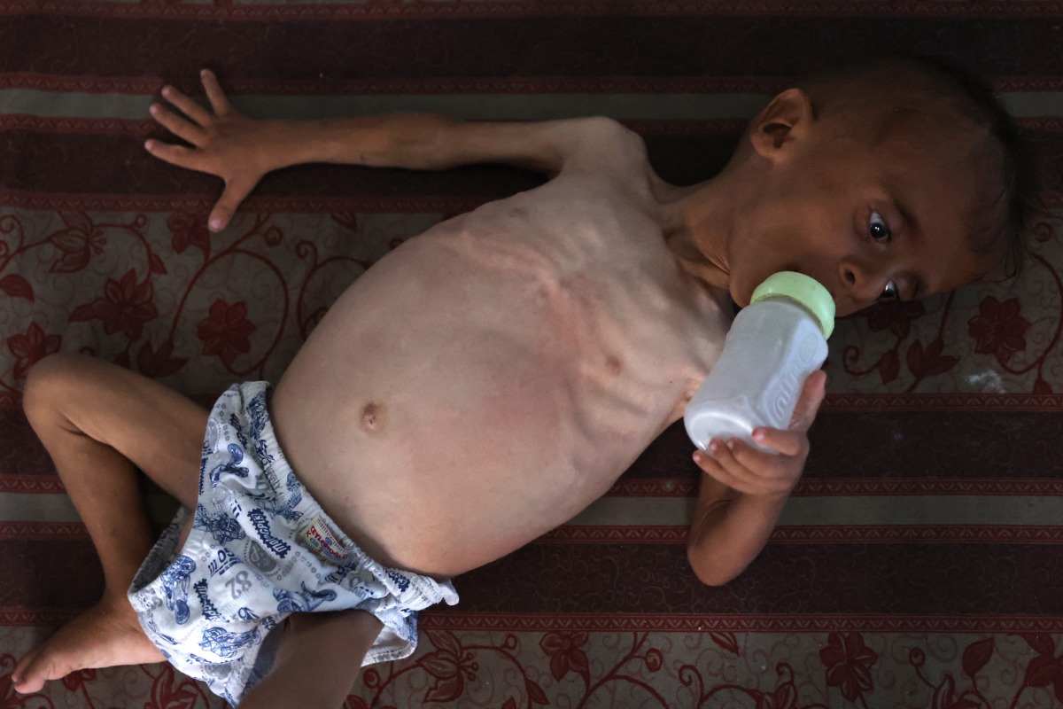 Mohammed al-Mutawaq, an 18-month-old Palestinian boy suffering from medical issues and displaying signs of malnutrition, drinks from a bottle as he lies on a mattress inside a tent in the Al-Shati refugee camp, west of Gaza City, on July 24, 2025. Photo by Omar AL-QATTAA / AFP.