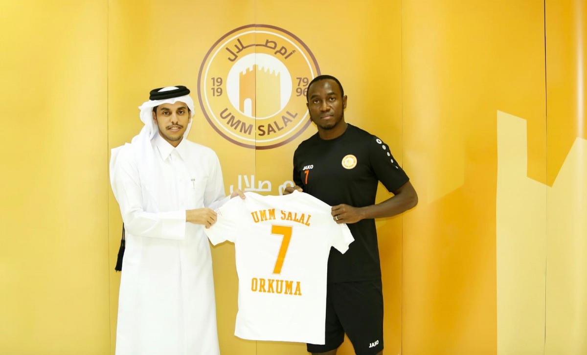 Nigerian former youth international Moses Orkuma holding a team jersey after joining Umm Salal yesterday. Orkuma will play against his former US Monastir team-mate Okpotu today.