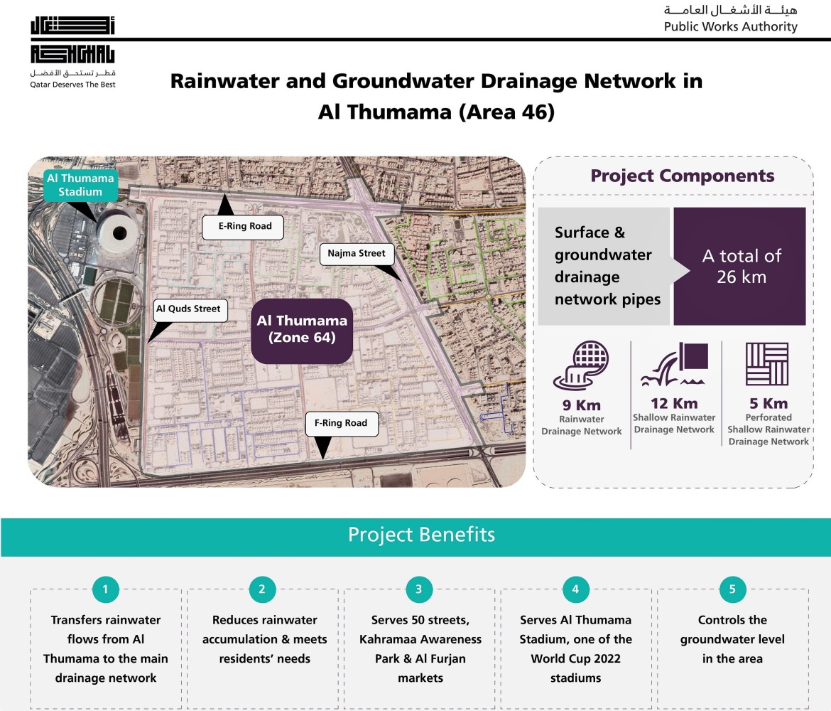 DOHA: The Public Works Authority (Ashghal) announces the completion of construction works of the rainwater and groundwater drainage network in the Al Thumama area (Zone 46) with a total length of 26 km covering 50 streets.