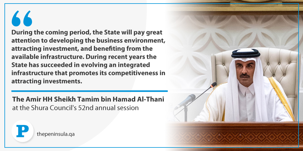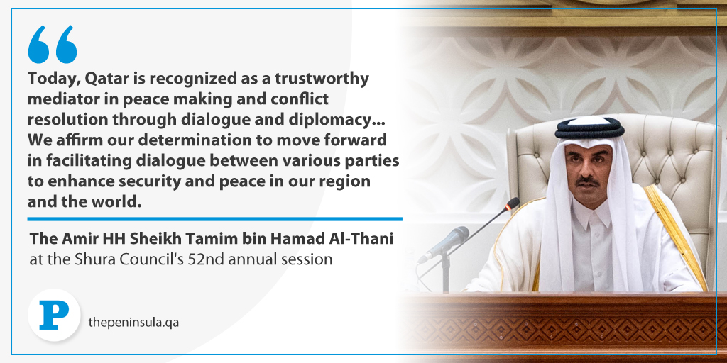 The Amir HH Sheikh Tamim bin Hamad Al-Thani was addressing the Shura Council's 52nd annual session on Tuesday morning at Tamim bin Hamad Hall at the Shura Council's headquarters.#Qatar #Doha #ShuraCouncil pic.twitter.com/l9twJpr20s